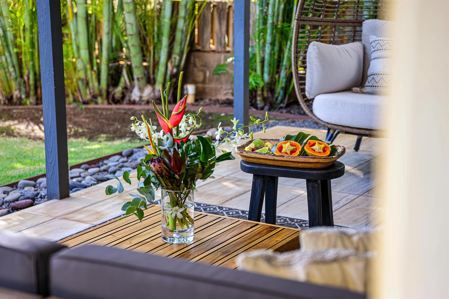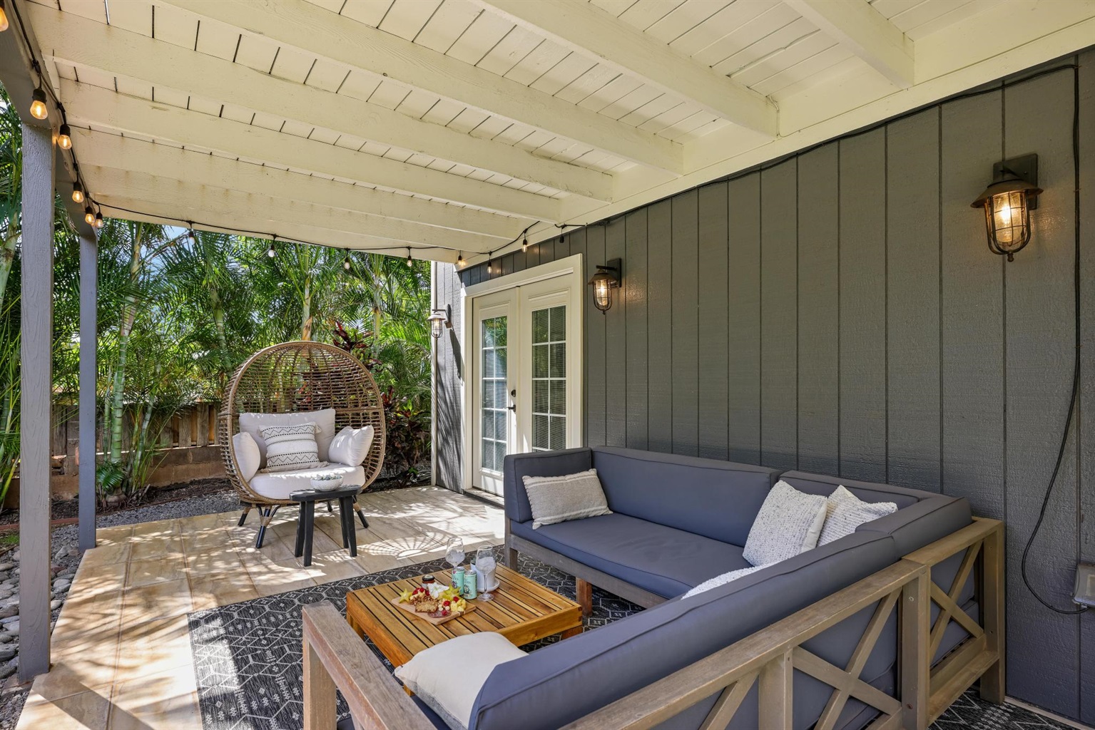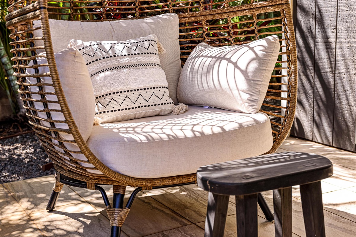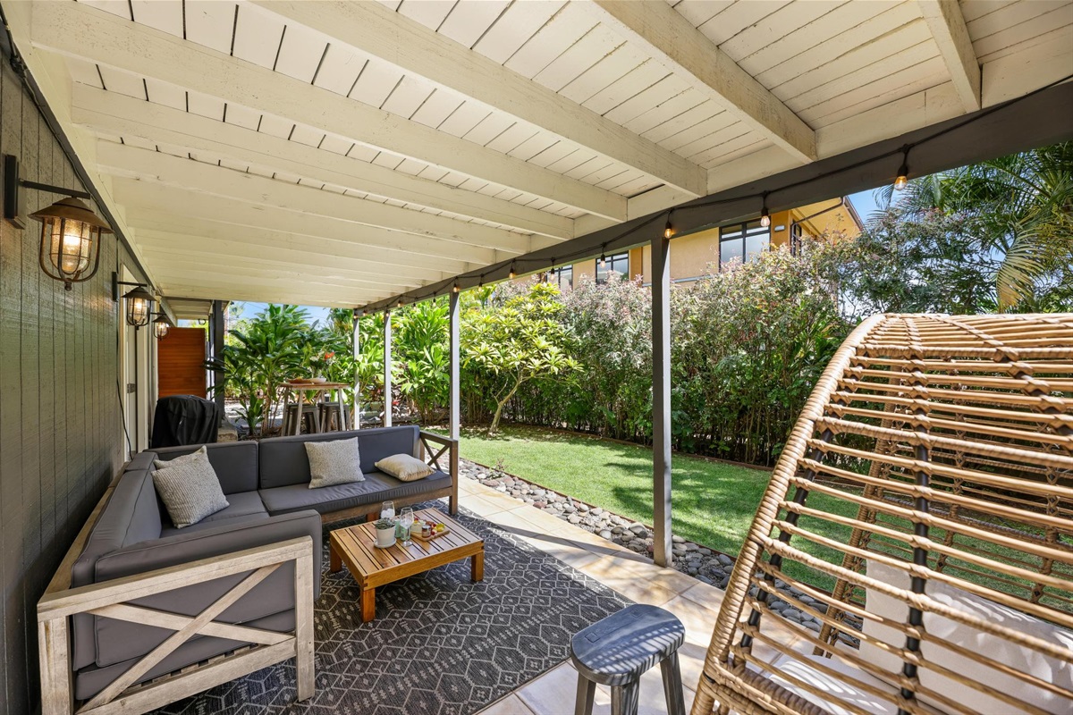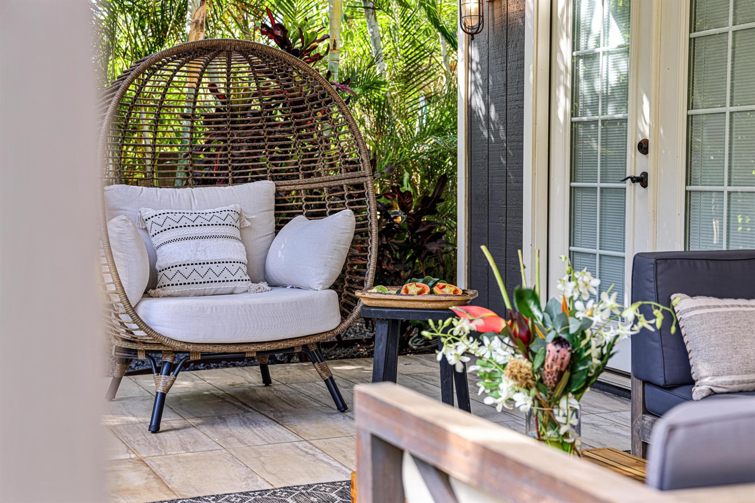 - Outdoor Living Space with table, sofa, and cool egg hanging chair