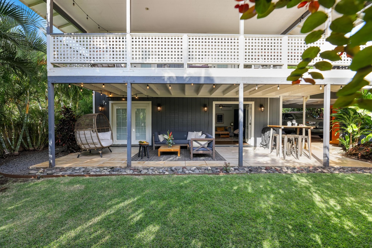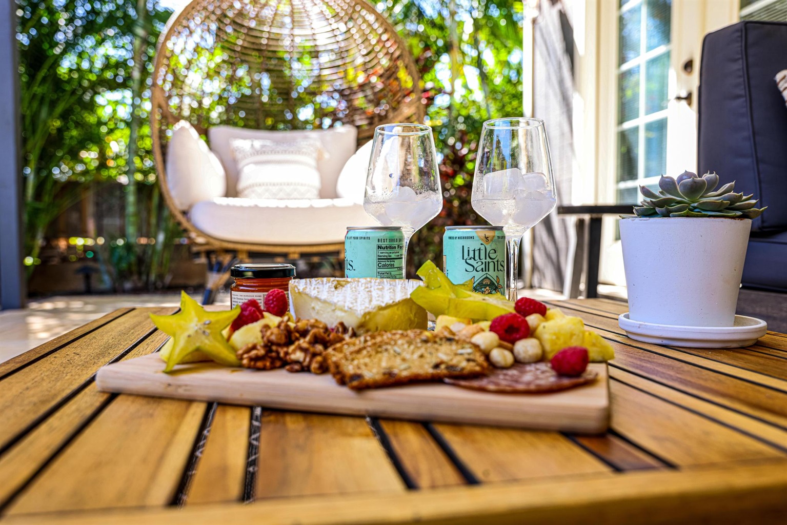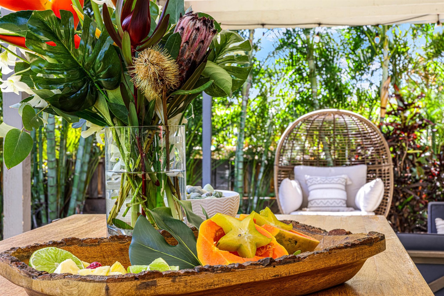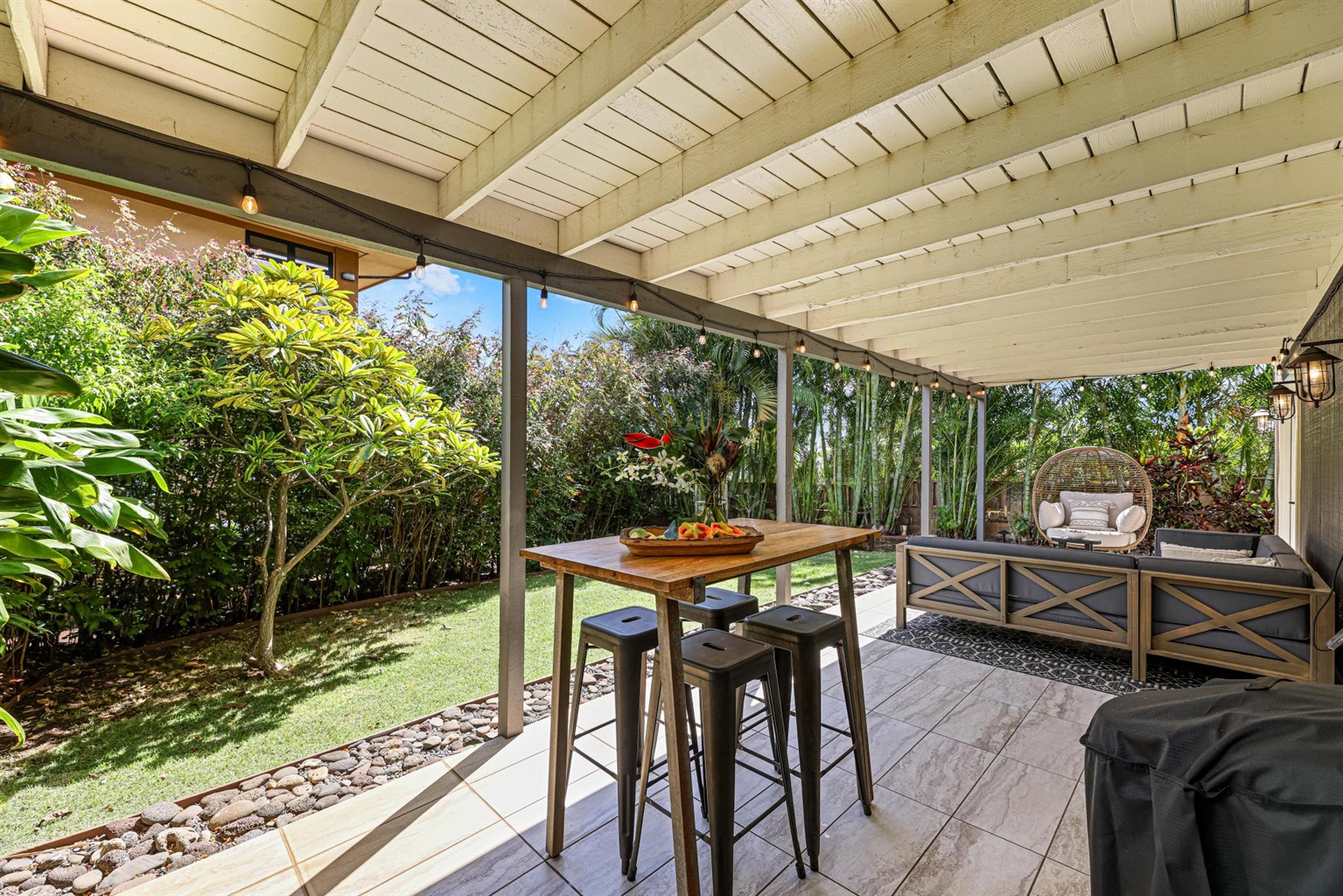 - Outdoor Living Space with table, sofa, and cool egg hanging chair