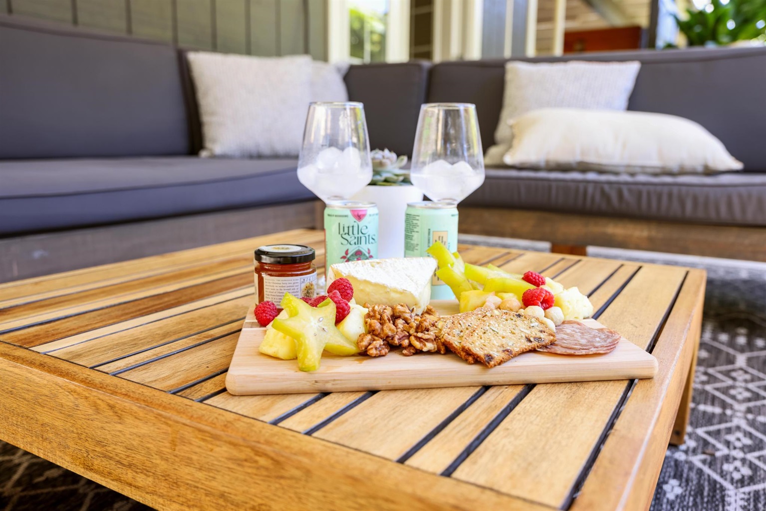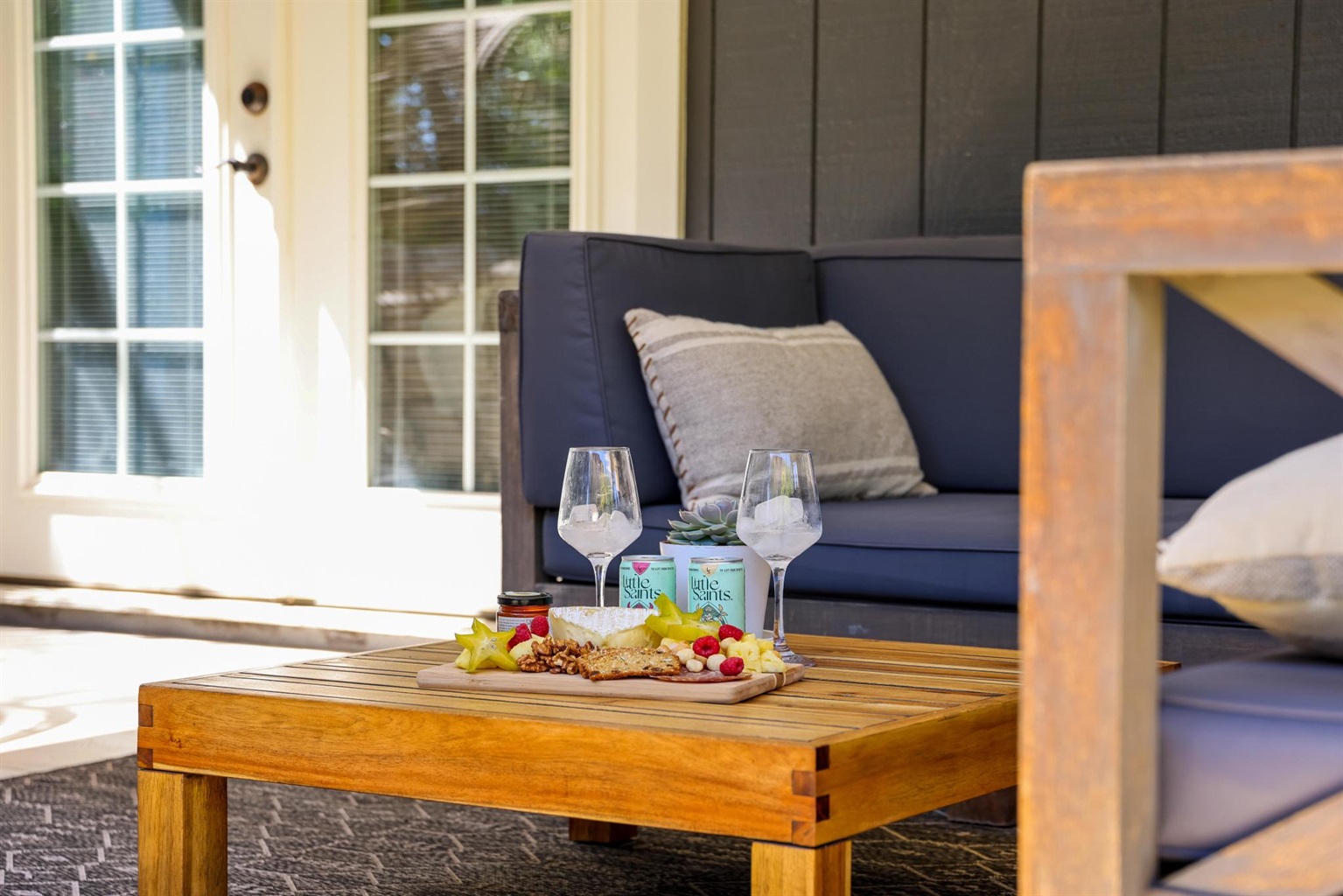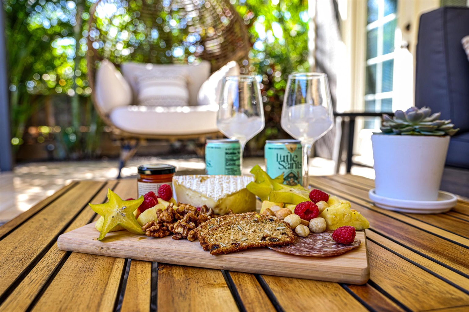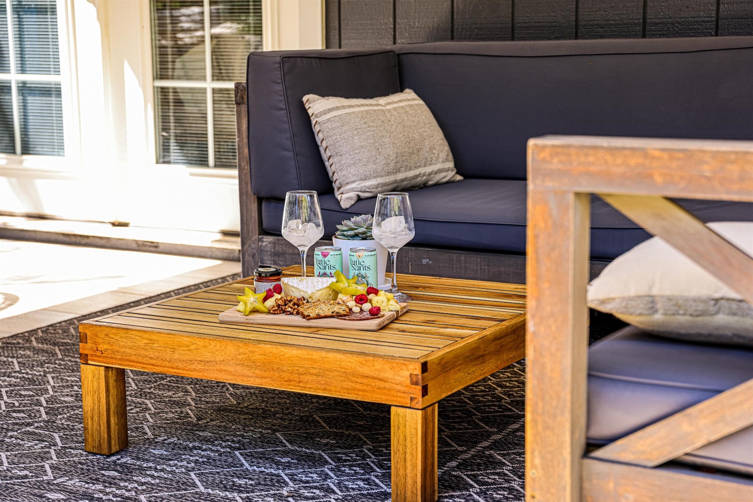 - Outdoor Living Space with table, sofa, and cool egg hanging chair