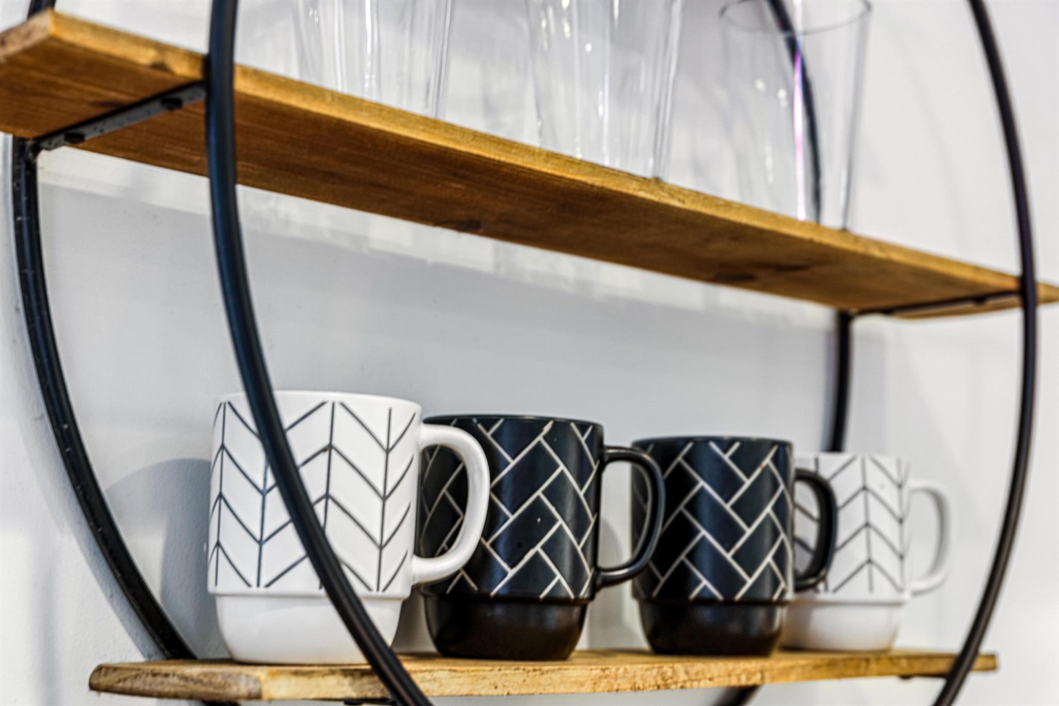 Large bar area includes plates, glasses, silverware, coffee mugs, coffee maker, hot water kettle, hot plate with pans and pots, Instant-Pot, microwave, salt, pepper, and more